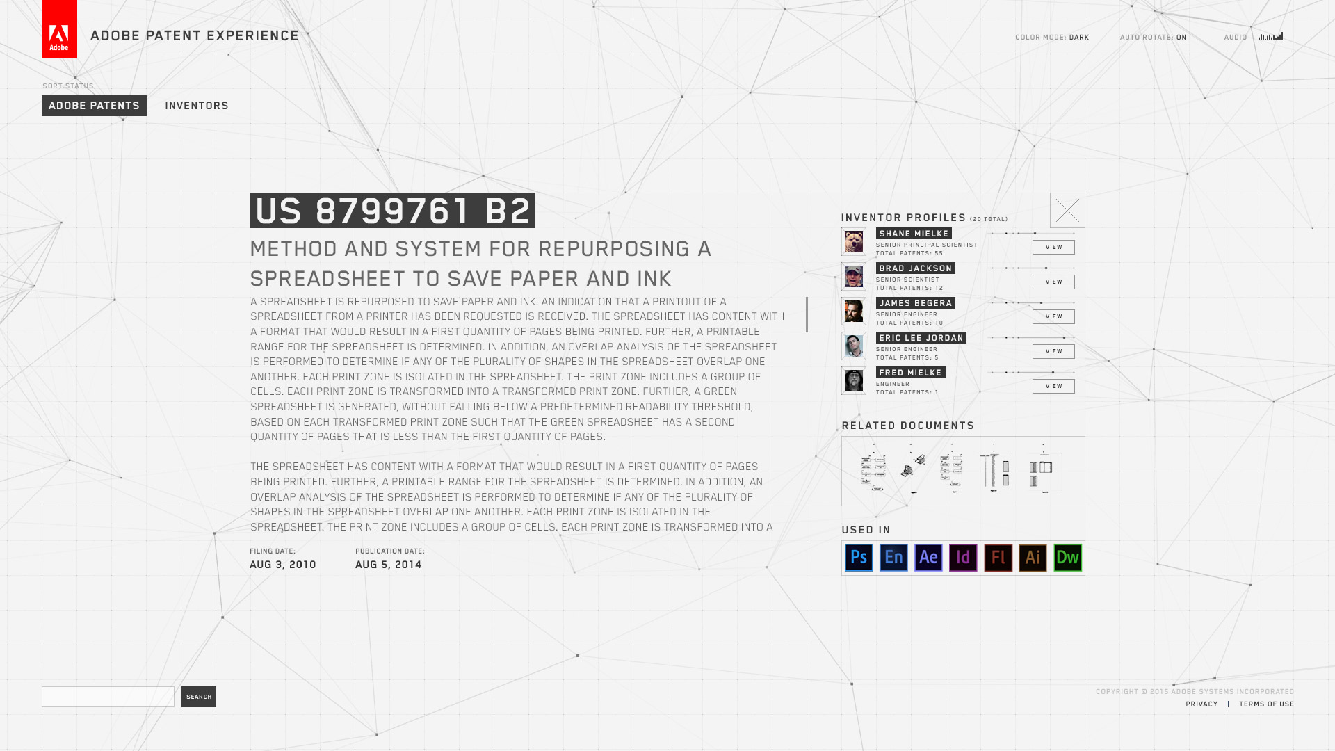 The Adobe Patent Experience is a touch-based installation that exists on the lobby wall of every Adobe office worldwide. Users can explore information about all of Adobe's patents and inventors.